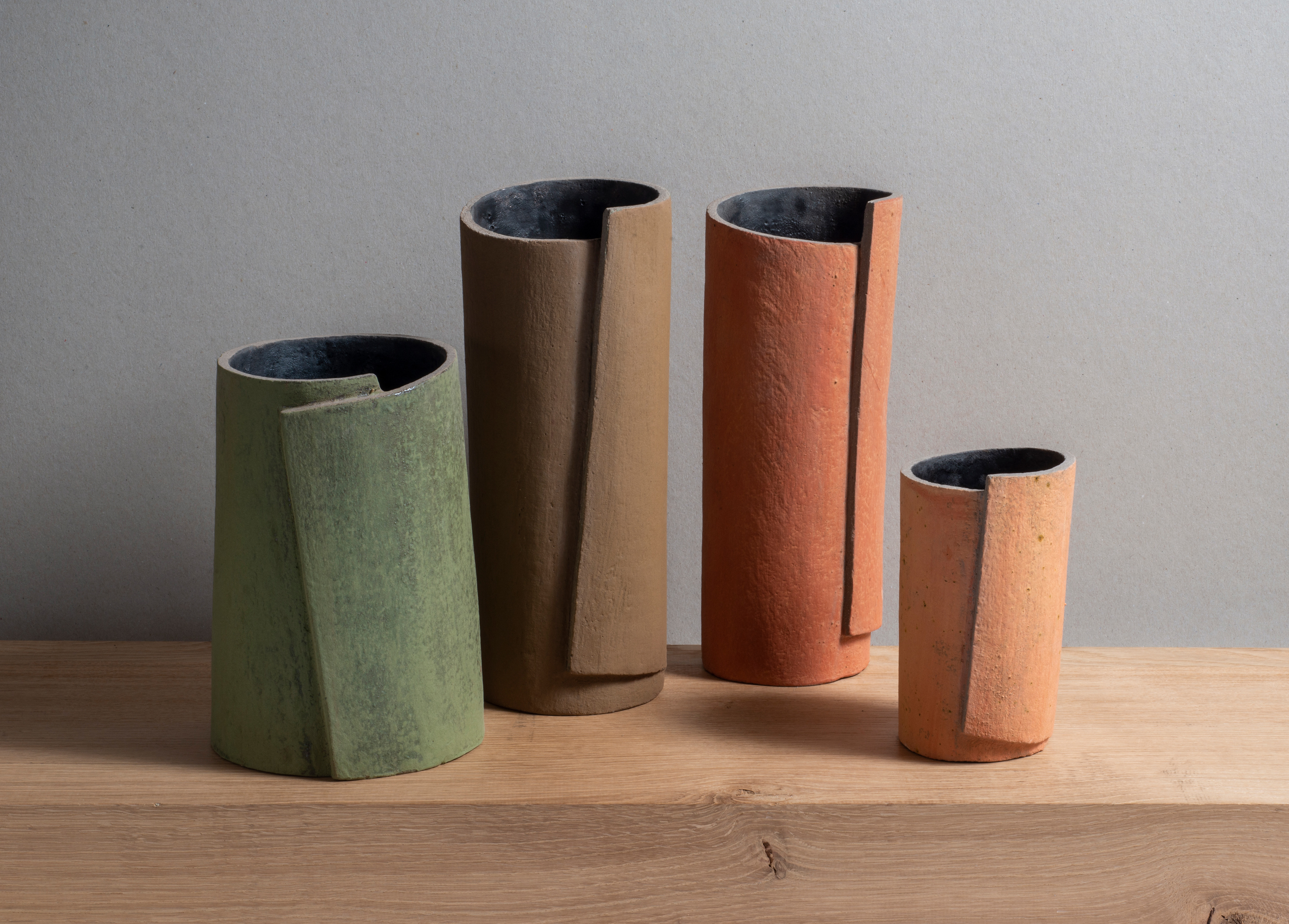 Au départ l’évidence qu’un volume peut se bâtir à partir d’une surface. Une plaque d’argile molle, sans déchirure, enveloppe un vide en laissant la construction apparente. Cuisson haute température, engobes de terres, oxydes métalliques